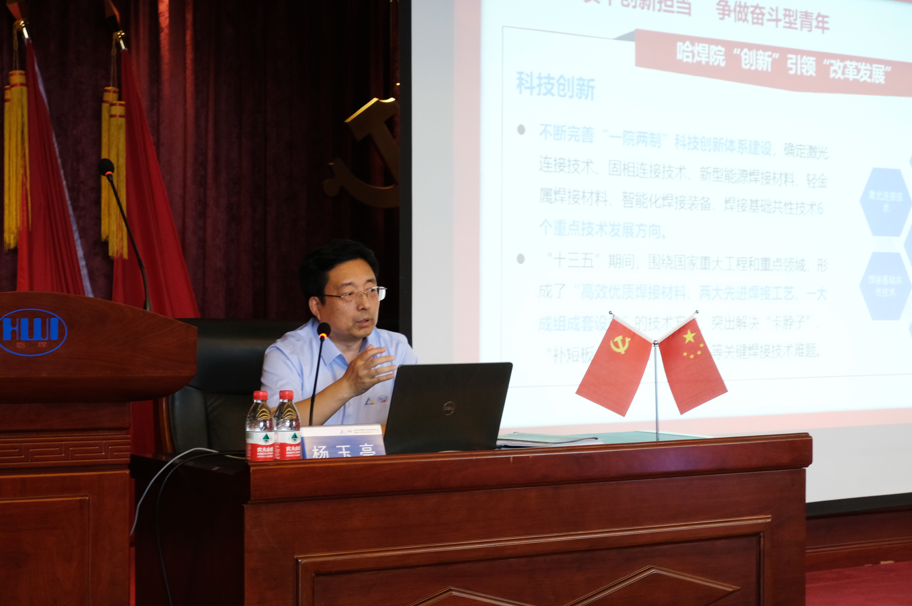 楊玉亭書記首先對(duì)習(xí)近平總書記“七一”重要講話精神及總書記在2021年中央黨校(國(guó)家行政學(xué)院)中青年干部培訓(xùn)班開班式上的講話進(jìn)行了宣講,引領(lǐng)青年回顧學(xué)習(xí)重要講話精神,堅(jiān)定信仰引航奮斗人生,筑牢思想政治基礎(chǔ),渲染青春底色。隨后,圍繞“把握政治建設(shè)內(nèi)涵 凝聚干事創(chuàng)業(yè)力量”,結(jié)合學(xué)習(xí)總書記關(guān)于加強(qiáng)思想政治建設(shè)的重要論述,激勵(lì)廣大青年干部堅(jiān)定理想信念,加強(qiáng)政治建設(shè),在不斷的學(xué)習(xí)與鍛煉中提升自己的干事創(chuàng)業(yè)能力,以實(shí)際行動(dòng)投身改革創(chuàng)新浪潮。最后楊書記結(jié)合哈焊院“創(chuàng)新”引領(lǐng)“改革發(fā)展”歷程及自身成長(zhǎng)經(jīng)歷,深刻闡釋了“使命擔(dān)當(dāng),青年任重道遠(yuǎn);機(jī)會(huì)空前,青年大有可為”,并對(duì)哈焊青年提出深切勉勵(lì)和殷切希望,號(hào)召?gòu)V大青年:堅(jiān)定理想信念 爭(zhēng)做學(xué)習(xí)型青年;實(shí)干創(chuàng)新?lián)?dāng) 爭(zhēng)做奮斗型青年;嚴(yán)格紀(jì)律約束 爭(zhēng)做先進(jìn)型青年。